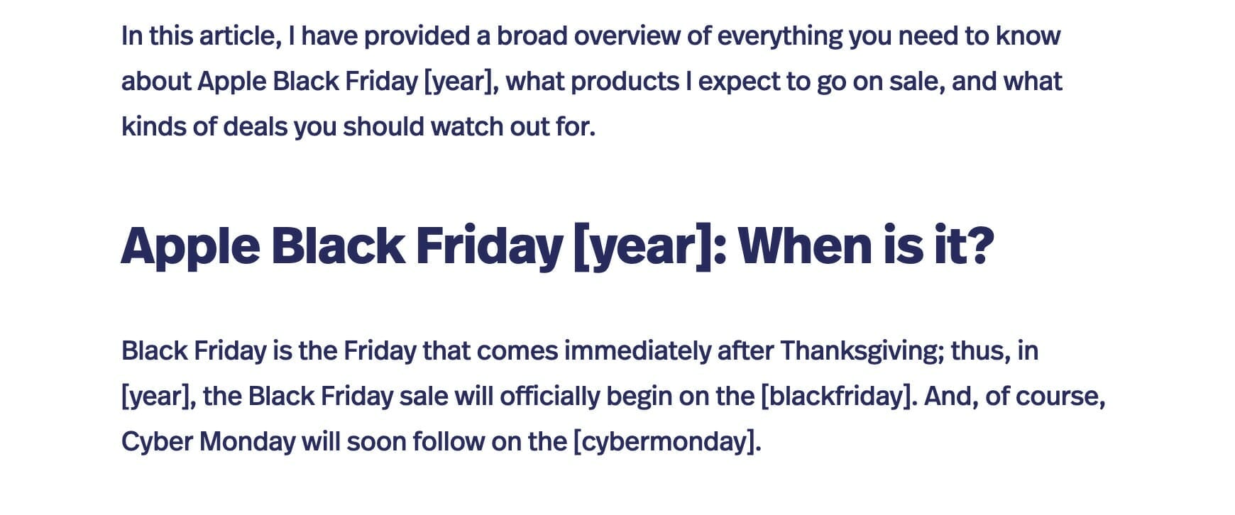 cto the shortcodes, like[cmonth],[cnmonth],[cmon]and so on. [weekday]for today’s day of the week like Monday and[wd]for the short form of the day like Mon.[blackfriday]to show Black Friday date like November 28.[cybermonday]to show Cyber Monday date like December 1[datemodified]to show the date current post was modified like December 15, 2024.[datepublished]to show the date current post was published like February 15, 2020.
